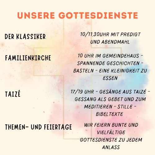 Wir laden Dich herzlich ein, Teil unserer vielfältigen Gottesdienste zu werden und gemeinsam mit uns Glauben und Gemeinschaft zu erleben. Ganz gleich, ob Du Ruhe, Inspiration oder eine kreative Familienzeit suchst – bei uns findest Du das passende Angebot.